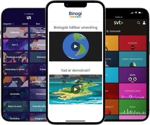 Trainiere mit beliebigen Inhalten von SVT Play, UR, YouTube oder Binogi. Durch die Kombination des Imvi-Trainings mit visuellem Inhalt werden Lesen, Aufmerksamkeit, Zusammenarbeit und Fachwissen – auf eine effektive und ansprechende Weise – gestärkt.