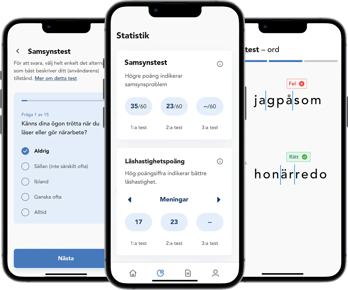 Vår test i appen måler lesefarten på hens språk. Vi måler lesefarten for bokstaver, ord og setninger & vår analyse indikerer en gjennomsnittlig forbedring på 70% etter treningsprogrammet er ferdig.